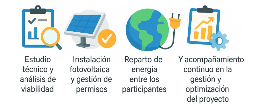 - Sin inversión inicial: No es necesario asumir el coste de instalación. Los participantes se incorporan al proyecto con una cuota o contrato de suministro adaptado a su consumo.